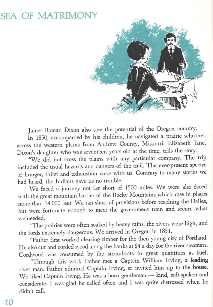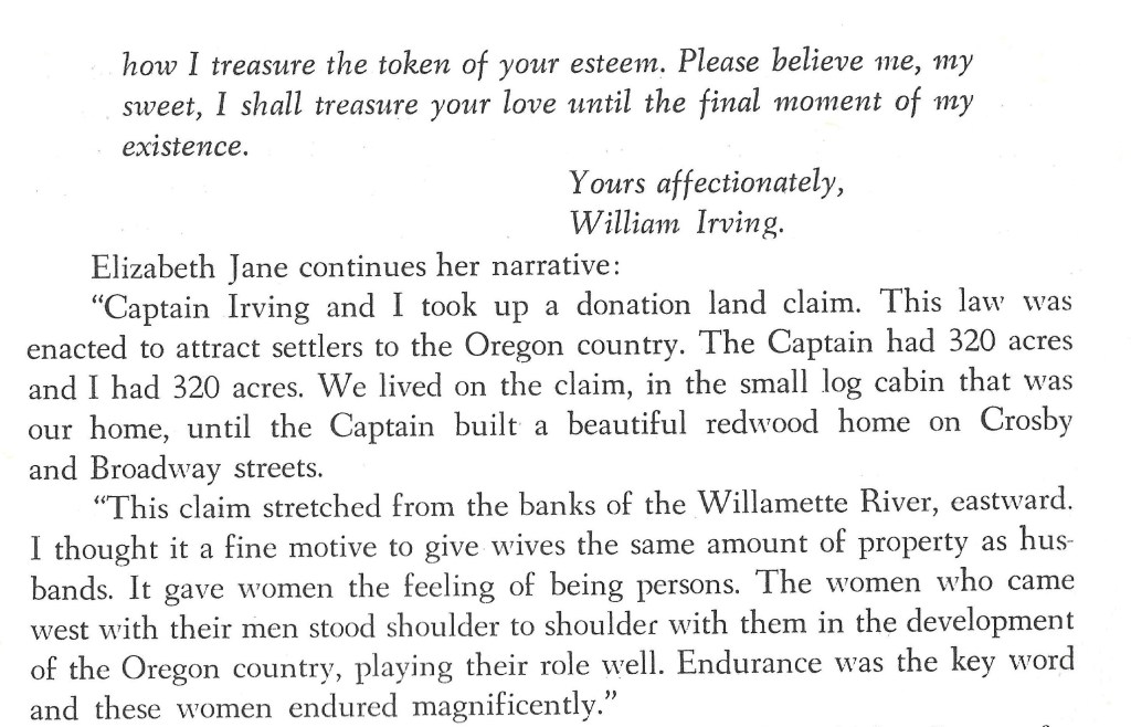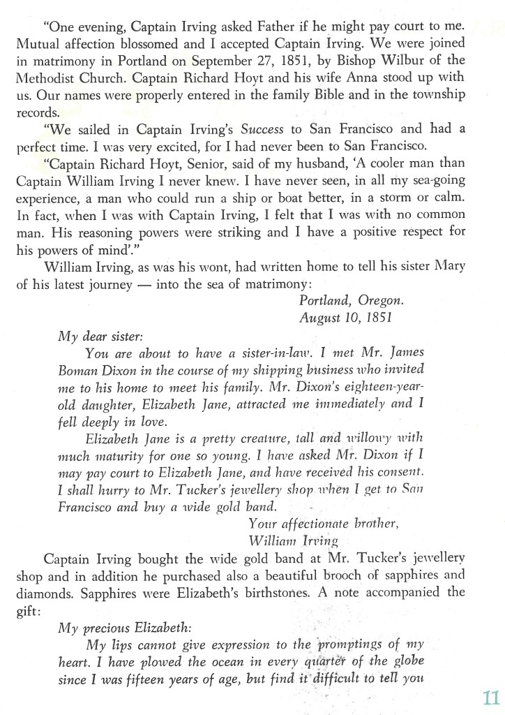 From a book called Saga of a Seafarer, the Annals of Capt. William Irving, written by Mary Aline Cox (granddaughter of Elizabeth), the pictures below tell a wonderful story of Elizabeth’s journey to Oregon and meeting her husband to be: