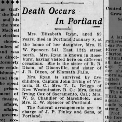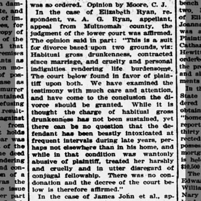 Elizabeth re-married again in 1889 to Anthony George Ryan. Unfortunately, it was not a marriage that would last as they would divorce in 1896. The divorce was granted in the Oregon courts as stated in the Statesman Journal citing habitual gross drunkenness and personal indignities rendering life burdensome on the part of her husband, Anthony.