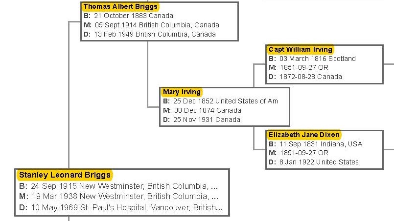 Elizabeth married Capt William Irving September 17, 1851, in Portland, Oregon. They lived in Portland until approximately 1859, when the family moved to Victoria, BC where William began a ship building business. At the time of the move, the Irvings had four children: Mary (born Dec. 25, 1852), John (born Nov. 24, 1854), Susan (born Mar. 10, 1857) and Elizabeth (born Dec. 29, 1859). The birth of their daughter, Nellie (born Nov. 12, 1862), is recorded in Victoria, BC. Nellie is the last child William and Elizabeth had.