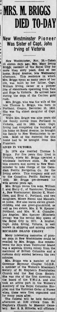 “Mary and Thomas Briggs were prominent figures in New Westminster society, and after Thomas’ death on November 27, 1920, Mary remained active in the community. She was a member of the Governor Seymour Chapter Imperial Order Daughters of the Empire (I.O.D.E.), the Women’s Missionary Society of St. Stephen’s Presbyterian Church, and the Red Cross Society. She was one of the first directors on the board of the Young Women’s Christian Association (Y.W.C.A.) and was also active in the Women’s Auxiliary of the Royal Columbian Hospital and the Victorian Order of Nurses. She remained a vital force in New Westminster until her death on November 25, 1931 at the age of 78.”