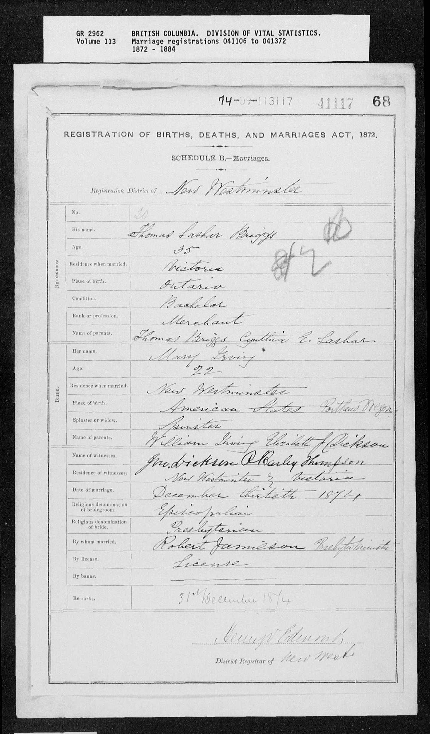 And herein lies my connection to the Irving branch of the Briggs family. In 1874, Mary Irving married Thomas Lasher Briggs on December 30th, just five days after her 22nd birthday. They were married by Reverend Robert Jamieson at Old St. Andrew’s Presbyterian Church in New Westminster.