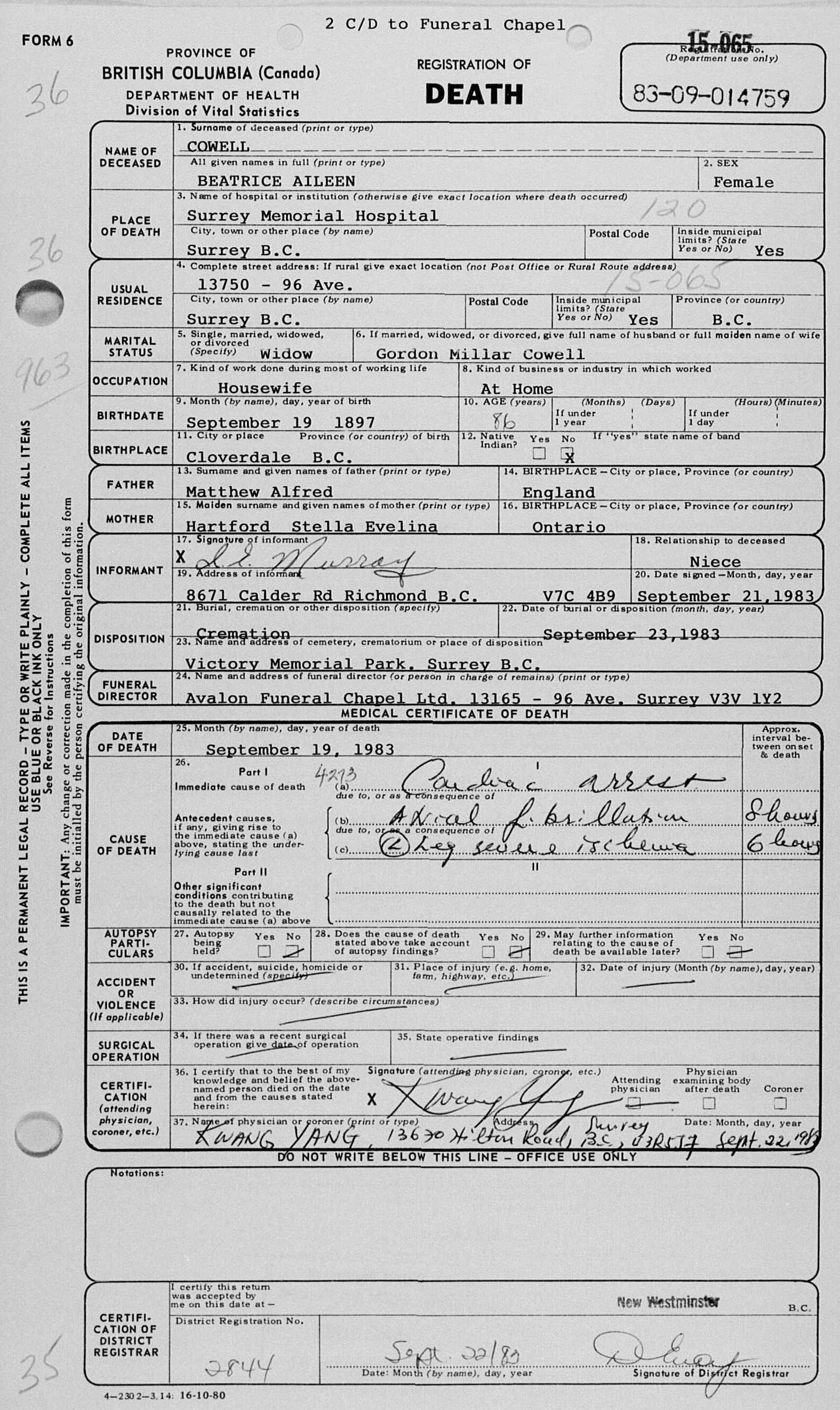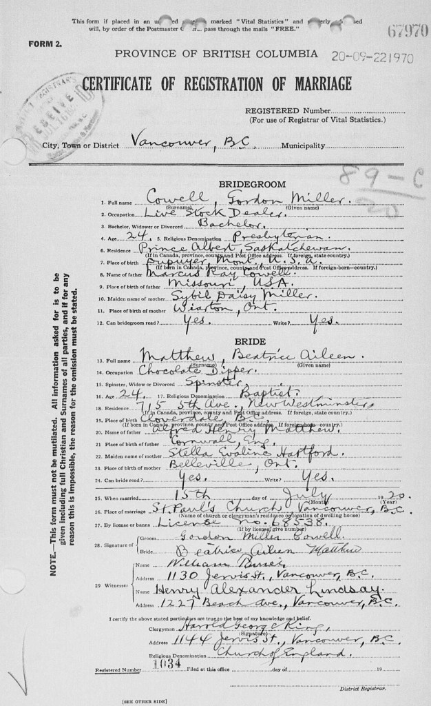 At the age of 24, Beatrice married Gordon Miller Cowell at St. Paul’s Church, Vancouver. Here’s a copy of the Certificate of Registration of Marriage. I really like her occupation – chocolate dipper! At this time, the residence is shown as 715 – 5th Avenue, New Westminster.