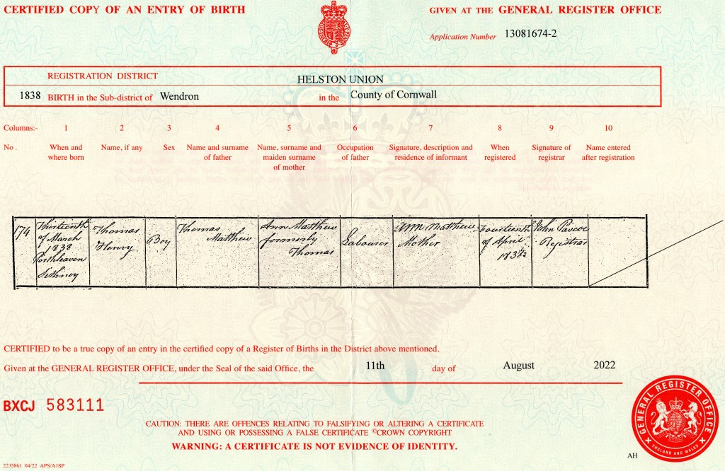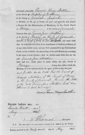 Thomas married Emma Jane Matthew (yes, that’s correct but that’s another story) July 30, 1862, in Breage, Cornwall, England.