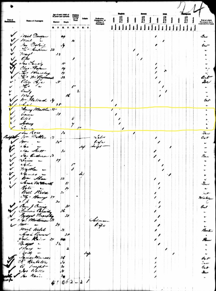 Thomas Henry Matthew (3x great-grandfather) – emigrated from Great Britain via Liverpool, England on June 3, 1874, arriving in Canada via Quebec, Quebec on June 18, 1874.