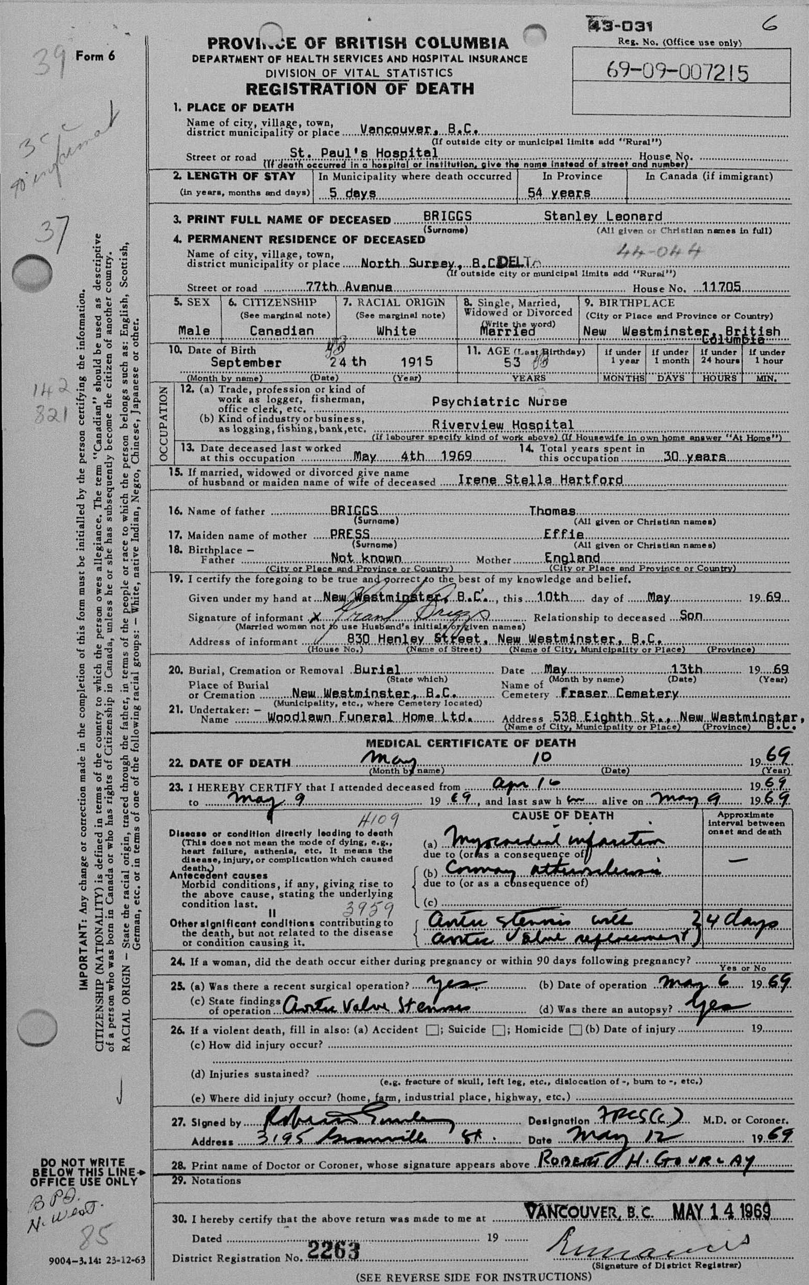 Registration of Death 1 Stanley Leonard Briggs – ca 1962 2