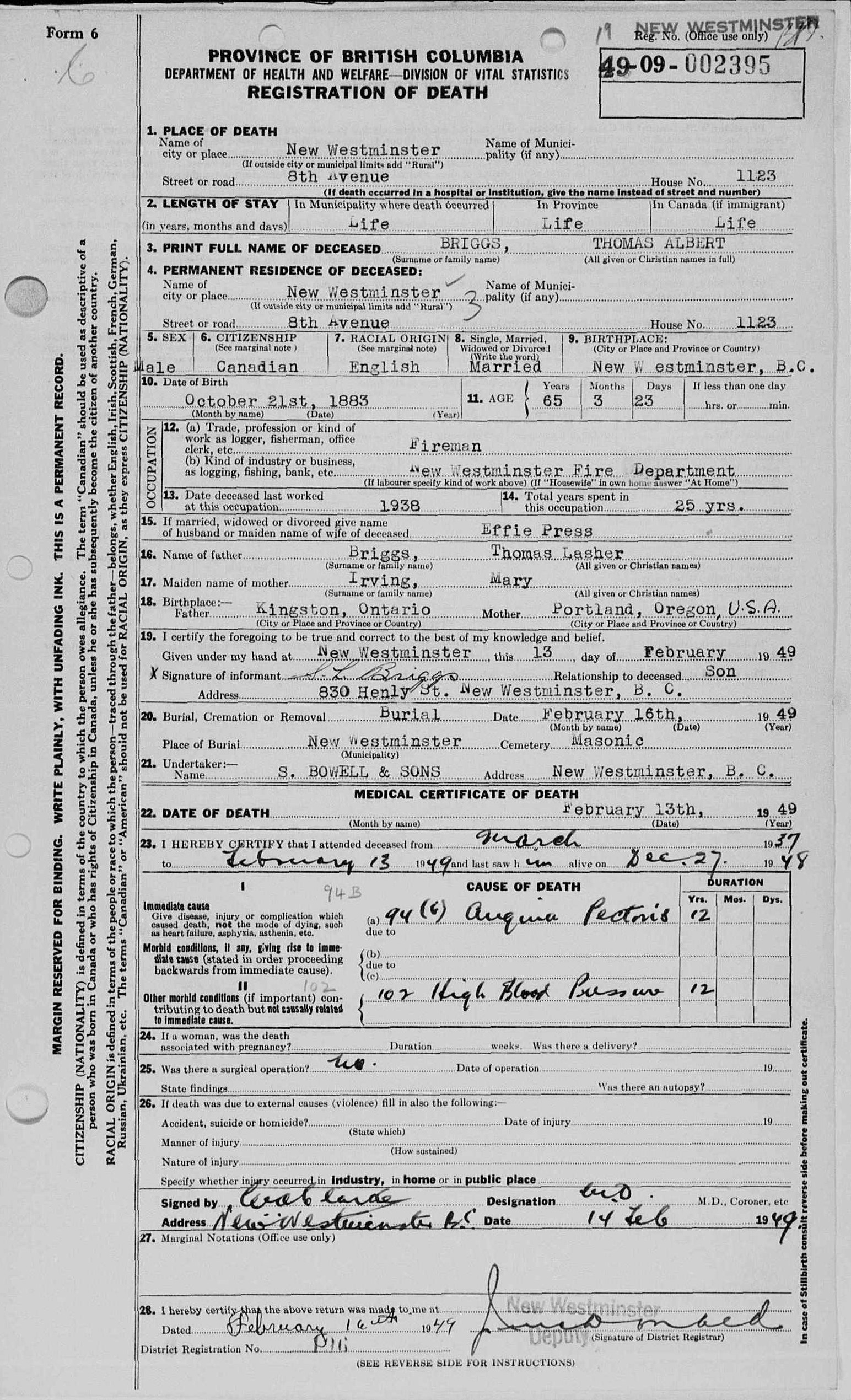 Thomas Albert Briggs, ca 1945 3 Registration of Death 4